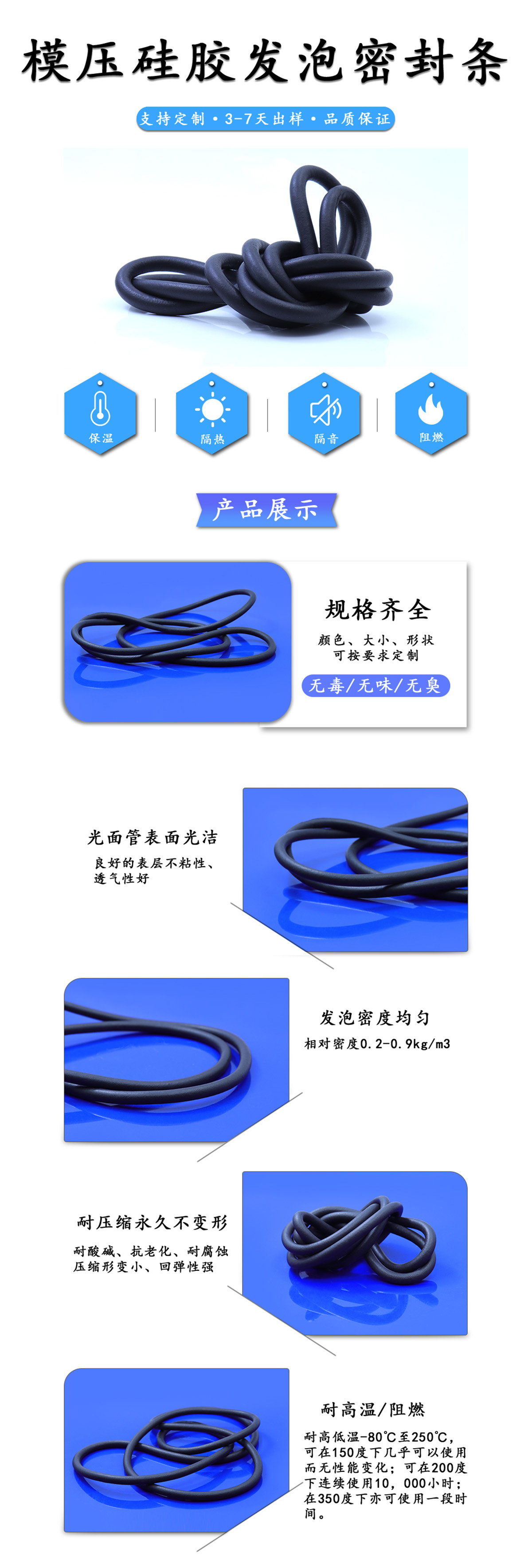 硅膠發泡密封條: 采用優質硅膠原料制作,安全無毒無味、顏色、大小、形狀可按要求定制